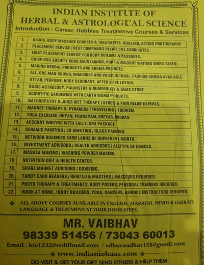 वैभव धुरंधर is an expert person in all courses mention in list and services. He is founder of Indian Institute Of Herbal And Astrological Science. He win 147 International, Nation and State awards, Last 25 Years he is in teaching Field. He is doing One man show like1 Third world war, 2. My hobbies are Different, 3 Somnath to Konark, 5 We our exercise diet, and surrounding etc are very populer in Maharastra He complete 4536 shows of all above subjects. He is teaching online off line courses in Mumvai, Pune, Thane, Aurangabad, Nashik, Mukbai and all over India and abrods., He wrote many articles and serials. In Marathi and hindi language. There are many courses he introdused for learn and earn and second income with practicales as well as his 12 peiple team ready to serve u all above subject all services also he provide he is yog theorapist, Massure, doctor in naturoathi, rekhi and lamafera expert, Mr universe in yog, Climbe 39 ountens and forts reverse call him to start his podcast and interview many peoples like him in various fields. He started making new products an theorapirs for all peoples.